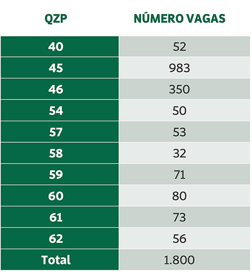 Para a região do Alentejo (QZP 54 a 58), foram abertas 135 vagas, enquanto nos QZP do Algarve (QZP 59 a 63) estão disponíveis 280 lugares. (ver tabela abaixo)